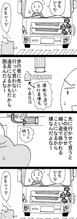 信号のない横断歩道でした。先に行かせてもらって、抜いて貰いました。